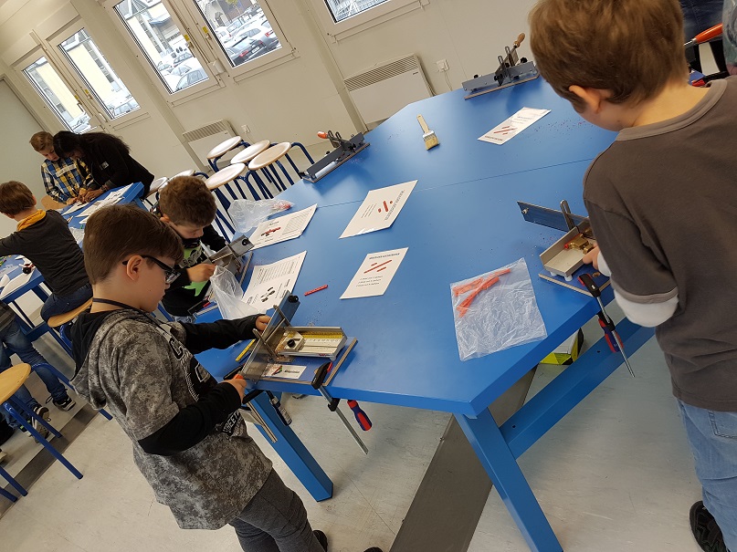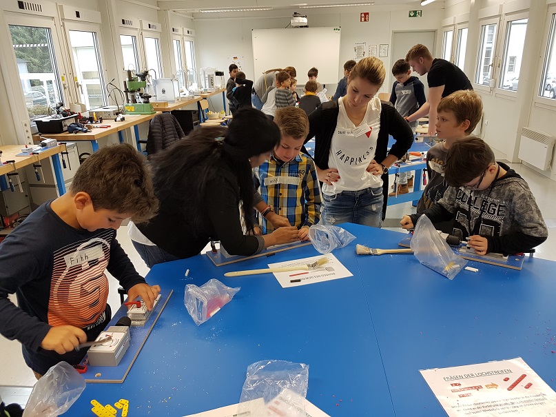 Angekommen und nach einem kräftigen Frühstück durften die Kinder unter Anleitung von Frau Thiel und ihrer Kollegin und einem Mitarbeiter der Firma Bleistahl in zwei Gruppen Materialien zusammensuchen und an den unterschiedlichen Maschinen ihre Teile bohren, sägen und schrauben.