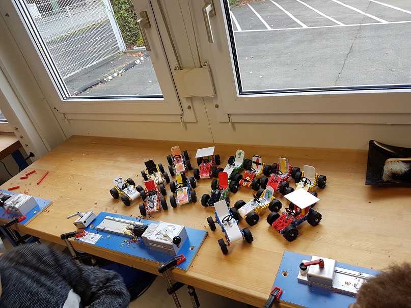 Jeder der 15 Kinder war selbst von den angekündigten Pausen nicht abzuhalten, weiter zu werken, so dass alle in 3 Stunden mit ihrem Fahrzeugen fertig waren. Teilweise wurde dann auch noch getunt, in dem weitere Teile angebracht und verändert wurden.