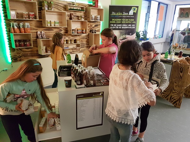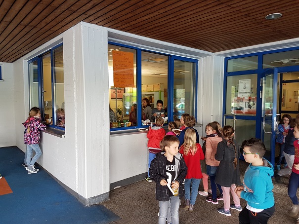 Nach viel Vorbereitung, tatkräftiger Unterstützung durch die Eltern und der ZWAR Gruppe und dem Ausbau des Shops wurden um 10 Uhr die Pforten geöffnet. Mit dem Duft von Waffeln und Schokosauce (natürlich FairTrade) in der Nase füllten sich mit vielen Gästen, wie z.B. der Bürgermeisterin oder der Agendabeauftragten die Stühle. Gespannt auf das folgende Programm eröffnete Herr Wittler mit seiner Rede das Programm. Die Kinder aus dem Schüpa führten gekonnt durch den Morgen und begrüßten den Chor als musikalische Begleitung aber auch die Referentin von FairTrade Frau Essing, um die Auszeichnung an unsere Schüler übergeben. Doch nicht nur dies gehörte zum heutigen Programm sondern auch die Rede der Bürgermeisterin und das Vorstellen der PowerPoint durch die Kinder des FairTrade Teams. Nach dem Abschlusslied wurden die Gäste eingeladen, den Shop zu besuchen. In der zweiten Pause konnten dann auch die Kinder Waren des fairen Handels erwerben. Bei Sonnenschein und guter Laune genossen die Gäste und die Kinder den tollen Morgen und freuen sich auf die weiteren tollen Momente in der grünen Oase.