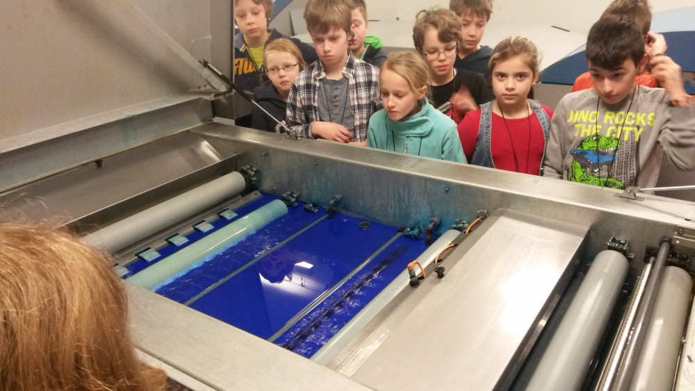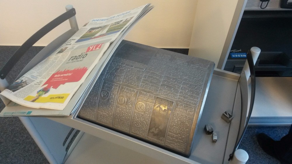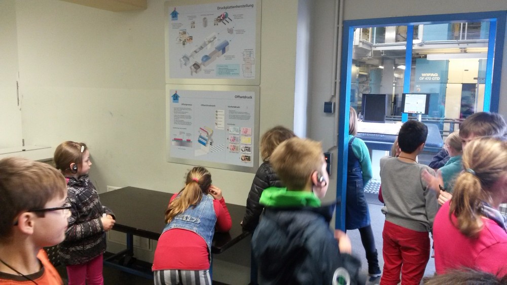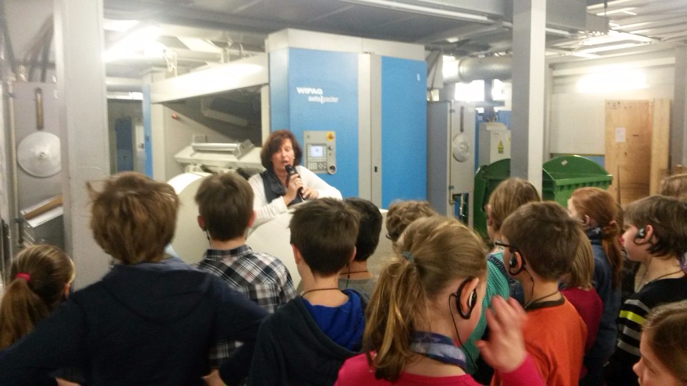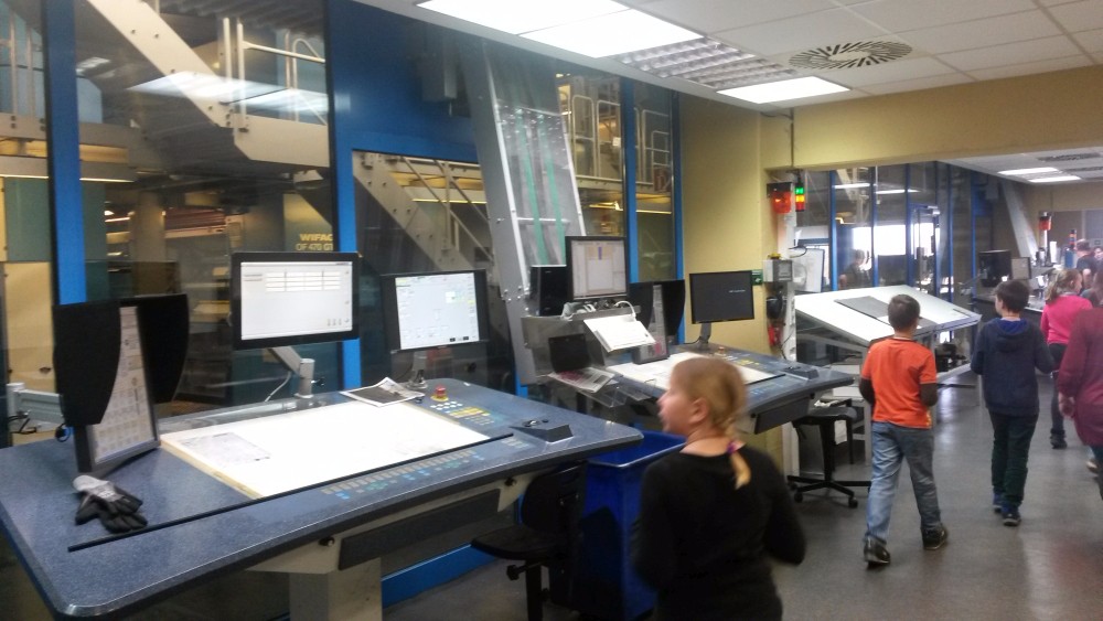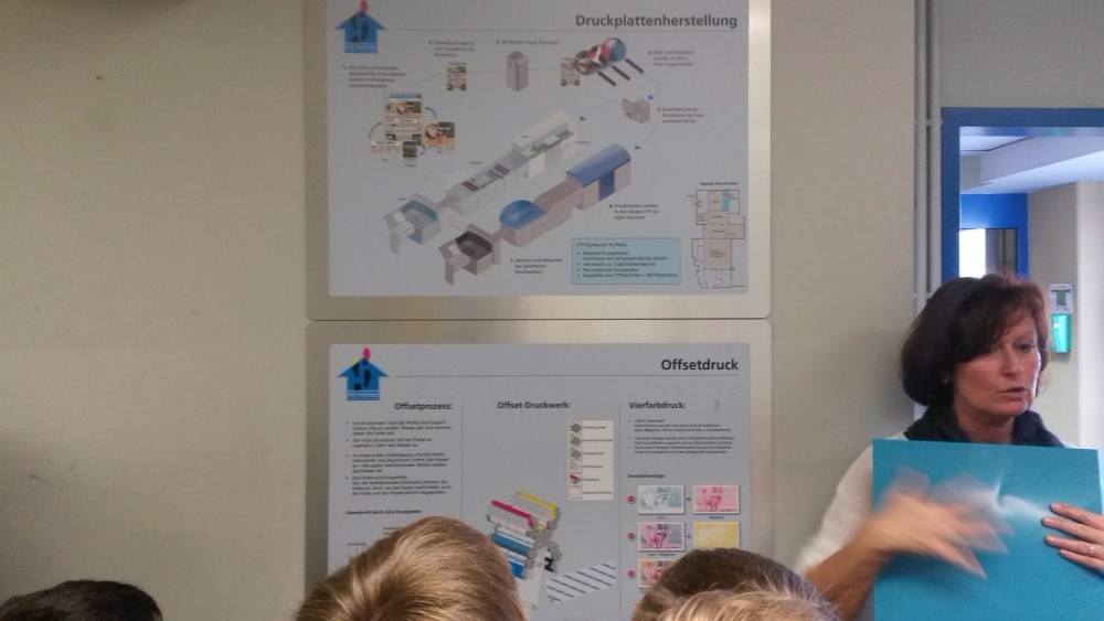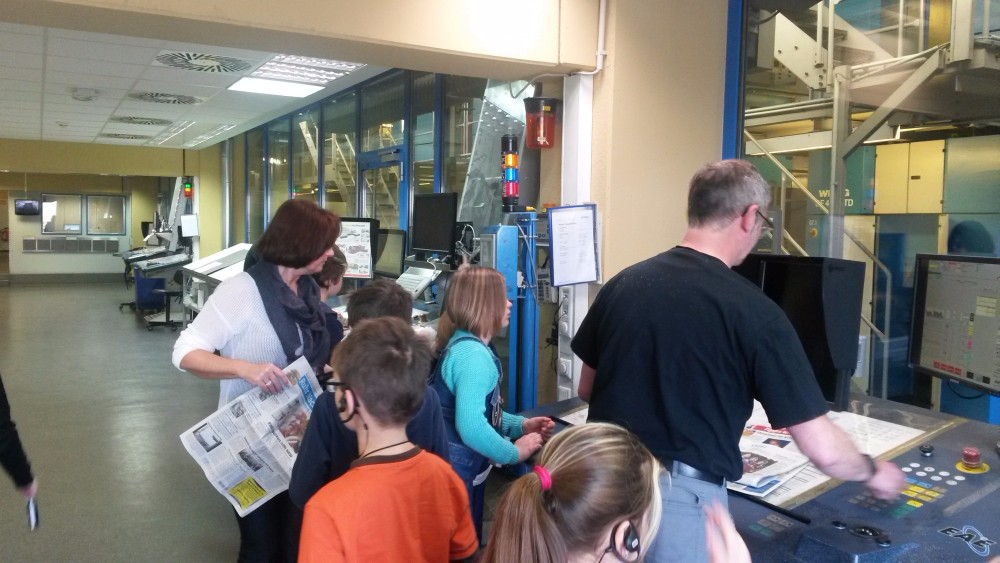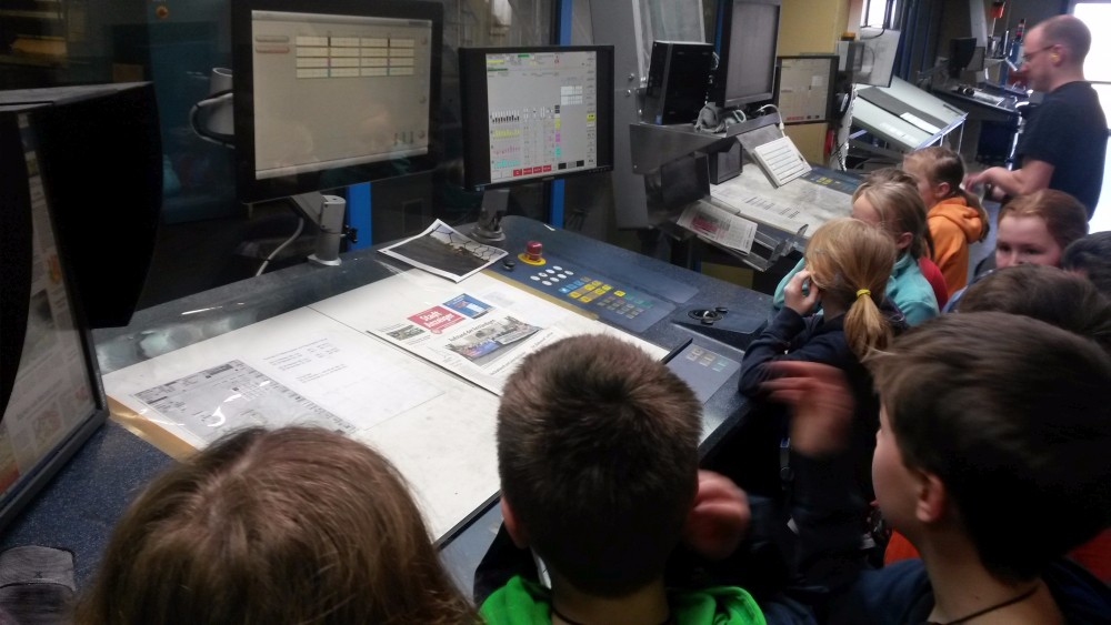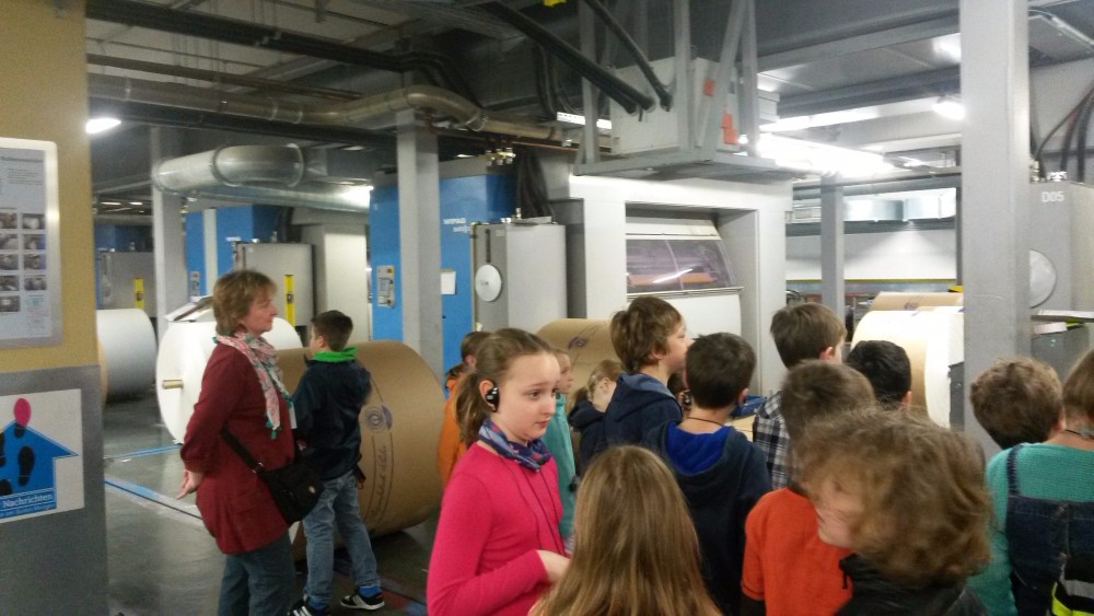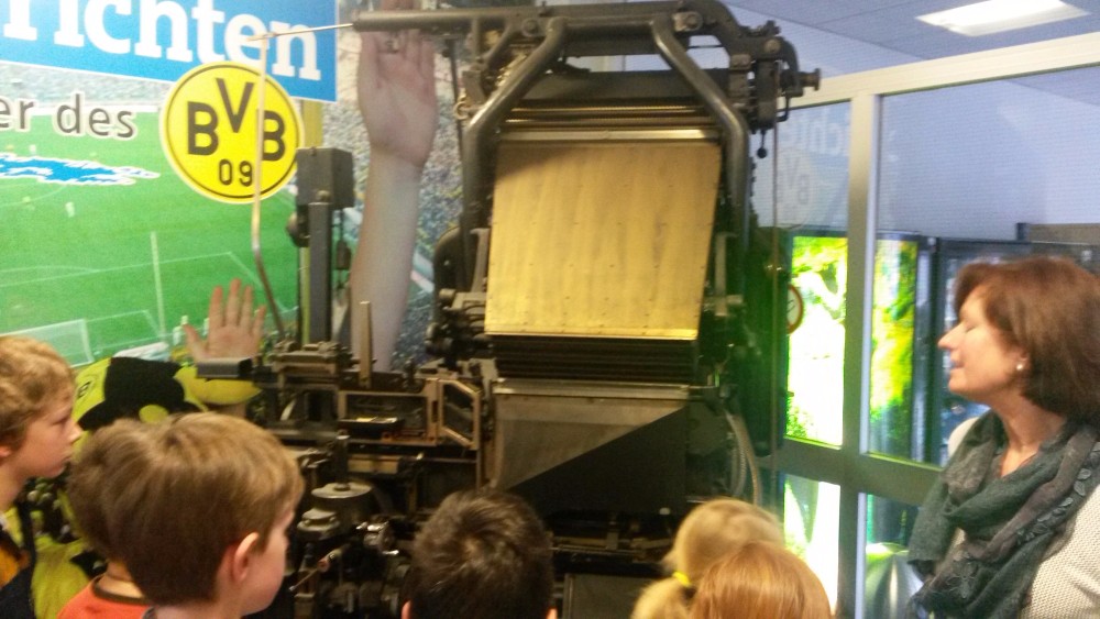 So machten sich Herr Singer und Herr Kirch mit den Medien Kursen des Jahrgangs 4 und der Schülerzeitung auf den Weg nach Dortmund und erhielten die Chance, hinter die Kulissen einer Druckerei blicken zu können. Da wir über 50 Personen waren, teilten wir die Gruppe auf, so dass eine Gruppe in die DASA ging und wir nach ca. 2 Stunden tauschten. Die Kinder erhielten wichtige Informationen, wie eine Zeitung entsteht und hergestellt wird. Die Führung begann im Konferenzraum, in dem die Kinder einen Film gezeigt bekommen haben und endete in einem großen Raum, in dem riesige Förderbänder Zeitungen transportierten. Zusätzlich wurde ihnen gezeigt, wie Druckplatten entstehen und wie vor einigen Jahrzehnten Zeitung hergestellt worden ist.